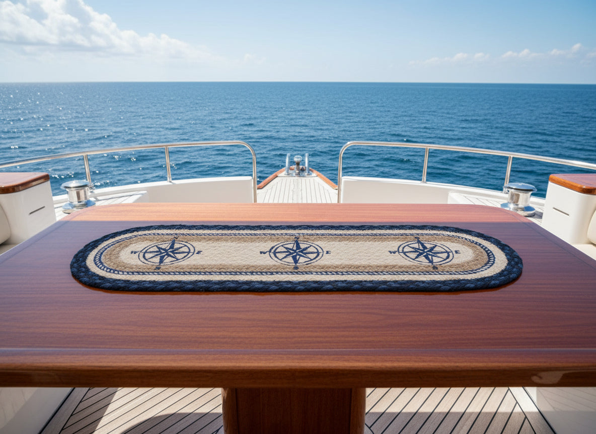 Crafted from sustainable jute, this versatile runner combines natural texture with timeless nautical appeal. The compass design adds sophisticated coastal charm to any space—whether adorning your dining table or defining your staircase. Durable and eco-conscious, it brings warmth and character to your home while celebrating maritime heritage.